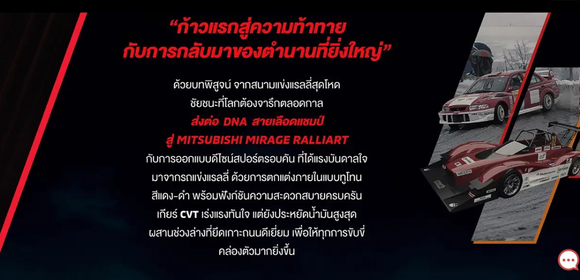 ตำนานที่ยิ่งใหญ่กลับมาแล้ว ส่งต่อ DNA สายเลือดแชมป์สู่ MITSUBISHI MIRAGE RALLIART กับการออกแบบดีไซน์สปอร์ตรอบคัน ที่ได้แรงบันดาลใจมากจากรถแข่งแรลลี่ ด้วยการตกแต่งภายในแบบทูโทนสีแดง-ดำ พร้อมฟังก์ชันความสะดวกสบายครบครัน เกียร์ CVT แร่งแรงทันใจ แต่ประหยัดน้ำมันสูงสุด ผสานช่วงล่างที่ยึดเกาะถนนดีเยี่ยม เพื่อให้ทุกการขับขี่ คล่องตัวมากยิ่งขึ้น