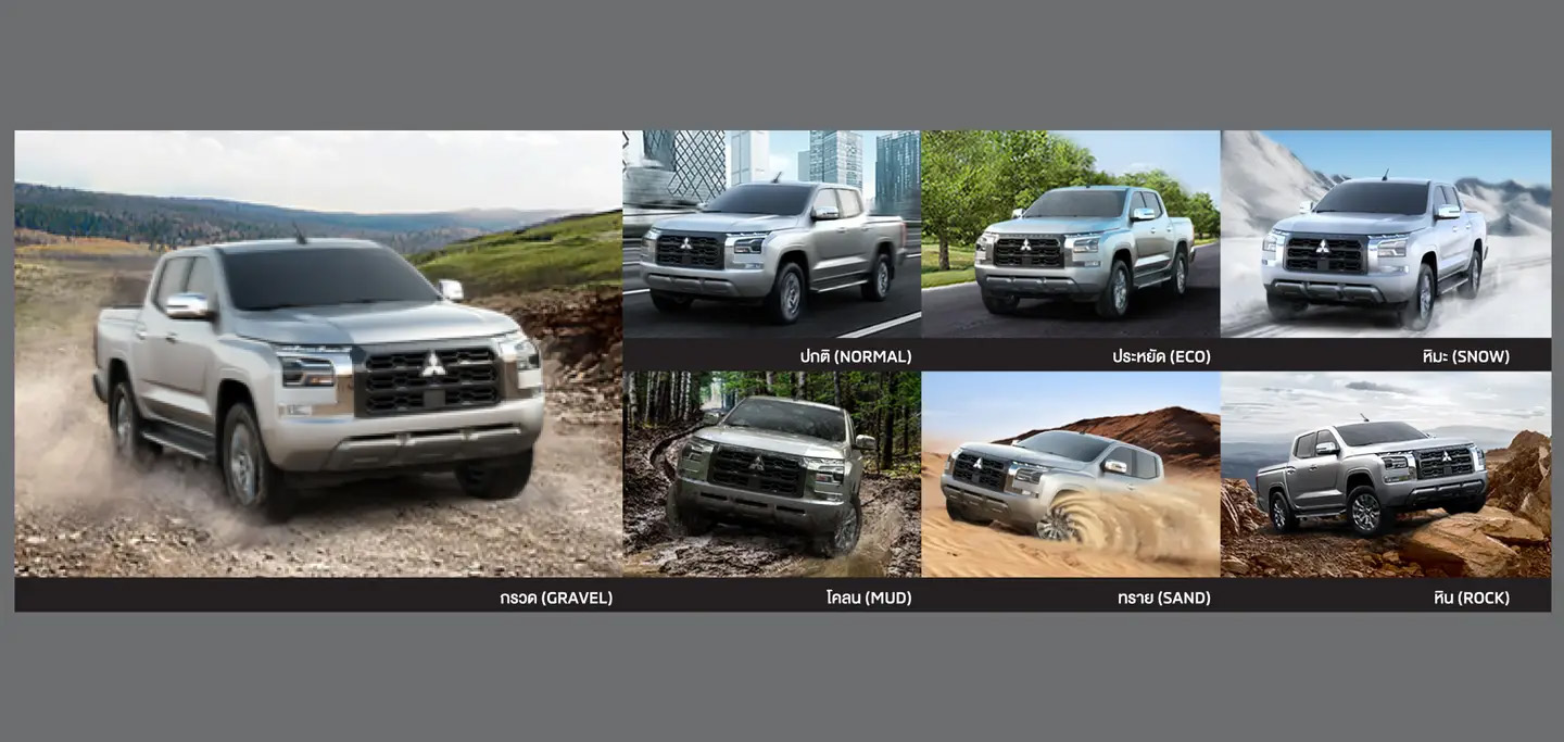 ไร้ข้อจำกัดทุกเส้นทาง กับ 7 รูปแบบการขับขี่ เลือกโหมดให้เหมาะสมตามสภาพเส้นทาง โดดเด่นเป็นพิเศษกับ Gravel Mode เทคโนโลยีเฉพาะของมิตซูบิชิ ที่สามารถทำความเร็วสูงสุดบนสภาพเส้นทางที่เป็นกรวดหรือบนพื้นถนนเปียกลื่น